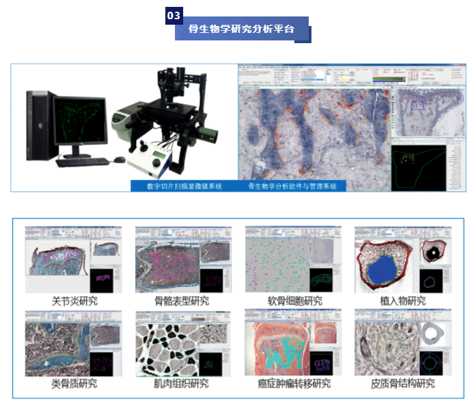 適用于骨形態(tài)學(xué)相關(guān)的病理學(xué)研究分析任務(wù),包括但不限于牙齒、頜骨與口腔種植體研究、植入物與生物材料研究、骨骼表型研究、骨腫瘤轉(zhuǎn)移研究、人體活檢組織切片檢查、骺骨和軟骨研究、皮質(zhì)骨結(jié)構(gòu)研究、骨關(guān)節(jié)研究、骨質(zhì)疏松與缺陷形成研究、破骨細(xì)胞分化分析、發(fā)育骨生物學(xué)研究、結(jié)節(jié)形成分析等涵蓋骨科研究的所有領(lǐng)域。