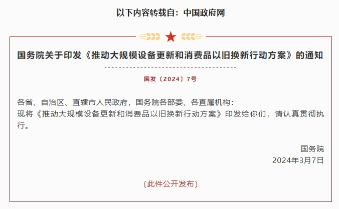 國(guó)務(wù)院關(guān)于印發(fā)《推動(dòng)大規(guī)模設(shè)備更新和消費(fèi)品以舊換新行動(dòng)方案》的通知 來(lái)源:本站 時(shí)間:2024-03-15 11:44:49