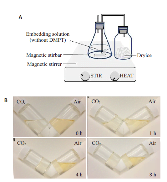 圖1 向包埋液沖入二氧化碳可以縮短包埋液的凝固時(shí)間Fig.1 Flowing CO2 into the embedding solution reduces polymerization time. A: Schematic diagram of flowing CO2 into theembedding solution; B: Represent pictures showing polymerization of the blocks in CO2 and air groups at 0, 1, 4, and 8 h. The pictures were taken immediately after tilting the vial to observe the viscosity and polymerization of the solution; C: Number of complete polymerized blocks of CO2 and Air groups over time(n=10); D: Rate of complete polymerized blocks of CO2 and Air groups (n=10).