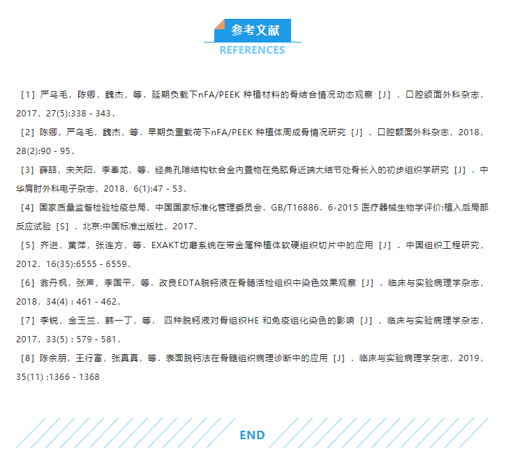 GB/T16886.6-2015 醫(yī)療器械生物學(xué)評價標(biāo)準(zhǔn)中提到對植入物的評價,要特別關(guān)注組織與材料之間的界面,且該標(biāo)準(zhǔn)推薦采用硬組織制片技術(shù)進行組織切片制作[4]。對埋置有種植體的組織標(biāo)本進行制片時,硬組織切磨技術(shù)可以直接切含有堅硬植入物的組織標(biāo)本,而普通的石蠟包埋組織切片需要先剔除組織內(nèi)埋置的植入物,這往往會使原有的組織結(jié)構(gòu)形態(tài)發(fā)生改變,無法客觀的評價植入物與周邊組織的結(jié)合情況,影響后期的評價分析。骨組織是由大量鈣化的細(xì)胞間質(zhì)和骨組織細(xì)胞組成,為結(jié)締組織的一種,因細(xì)胞間質(zhì)內(nèi)有大量鈣鹽沉積,故骨組織質(zhì)地十分堅硬,石蠟包埋組織切片必須對骨組織進行脫鈣處理[6-8]。脫鈣會使組織細(xì)胞皺縮,同時會使骨的礦化結(jié)構(gòu)遭到破壞,而硬組織切磨技術(shù)無需脫鈣處理,完整的保存了骨組織的礦化結(jié)構(gòu),組織切片經(jīng)染色處理后,可用于研究骨修復(fù)材料植入后的骨組織形態(tài)計量學(xué)及骨整合相關(guān)的研究。雖然樹脂包埋硬組織制片也存在不足,如制片過程復(fù)雜,制片操作步驟繁瑣,盡管存在難點,但硬組織切磨技術(shù)能夠保持種植體與周邊組織界面的組織結(jié)構(gòu),可直觀反應(yīng)結(jié)合界面的生長結(jié)合情況,是目前研究種植體-組織結(jié)合界面重要的技術(shù)方法。